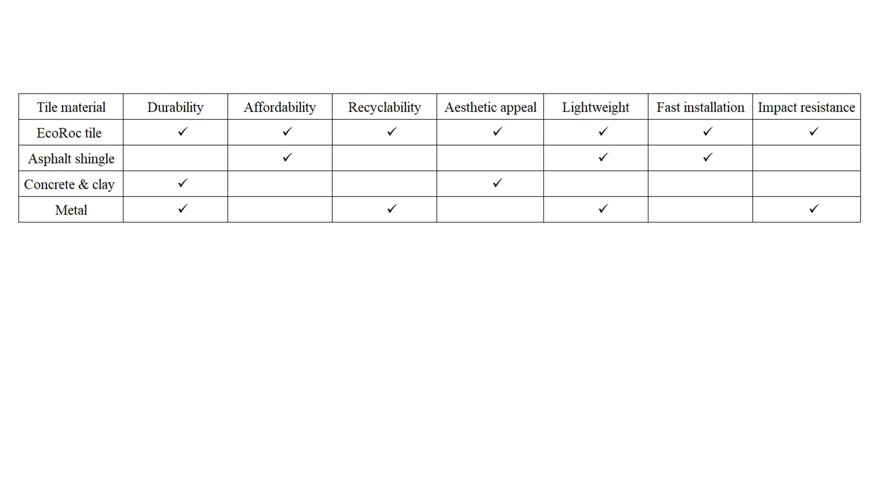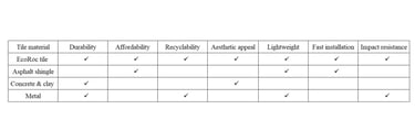 EcoRoc's roof tiles ensure durability, impact resistance, affordability, recyclability, aesthetic appeal, lightweight design, and fast installation for optimal performance.